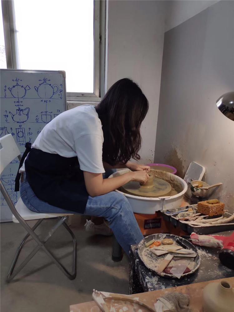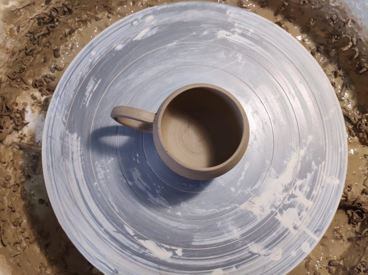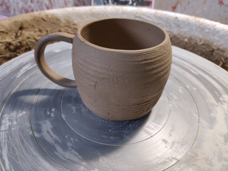 在旋转中杯子成型了,粘好把手晾干,等待入窑